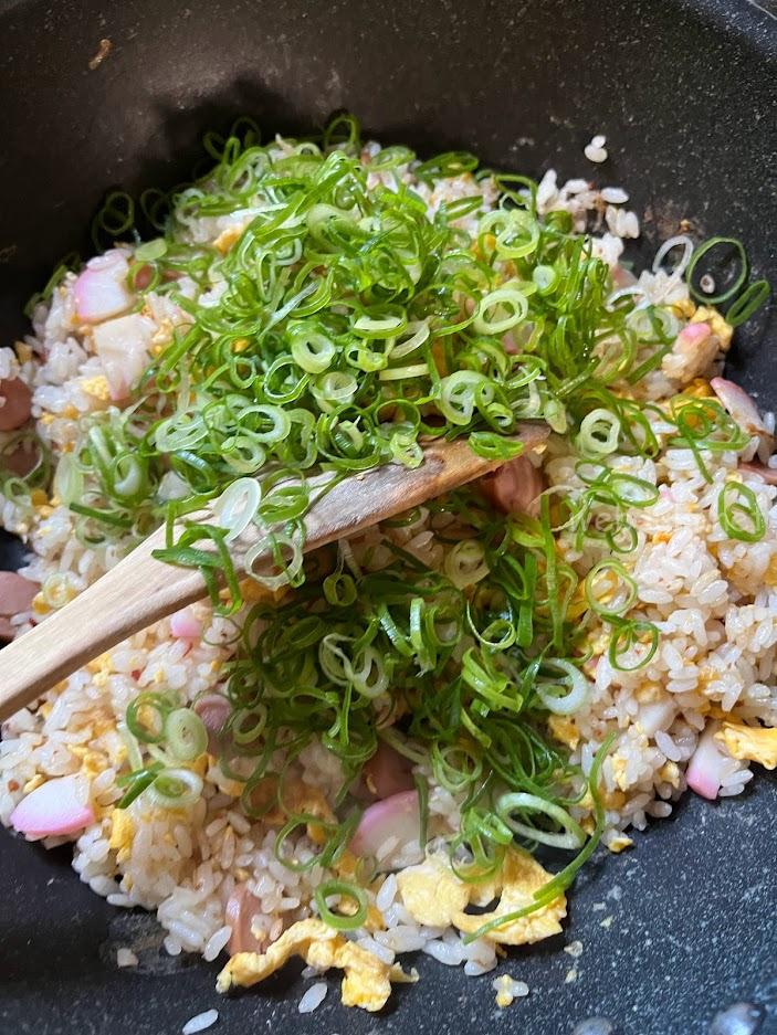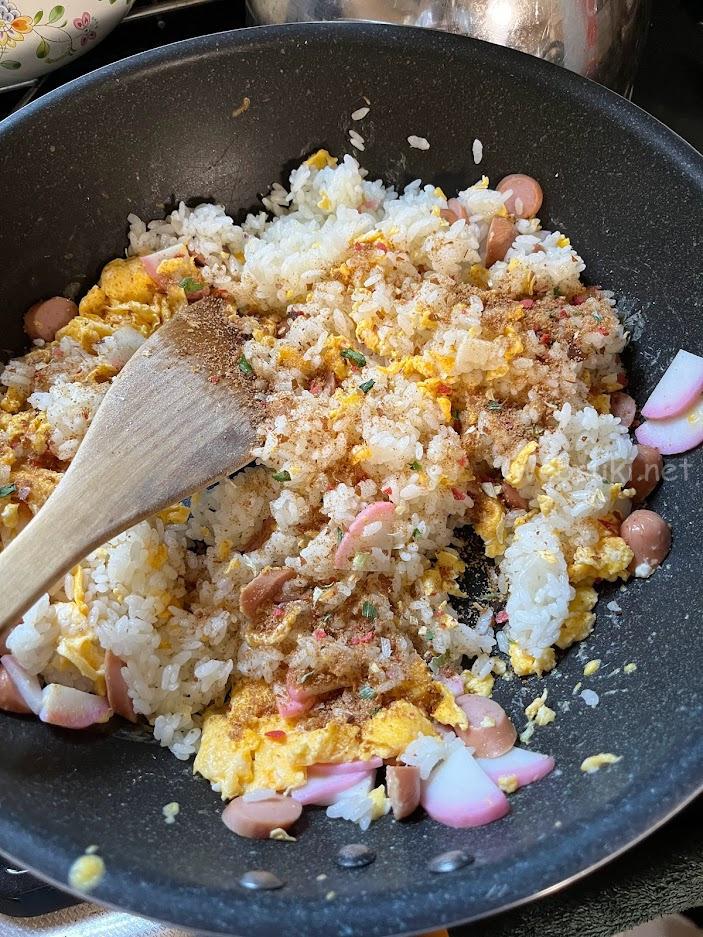 永谷園の公式ページにもあるとおり、卵とご飯を用意してフライパンで3分炒めるだけ…なんですが、うちでは蒲鉾とウインナーとネギがあったので一緒に入れました。蒲鉾は安いやつなんですけど、結構あると便利です。